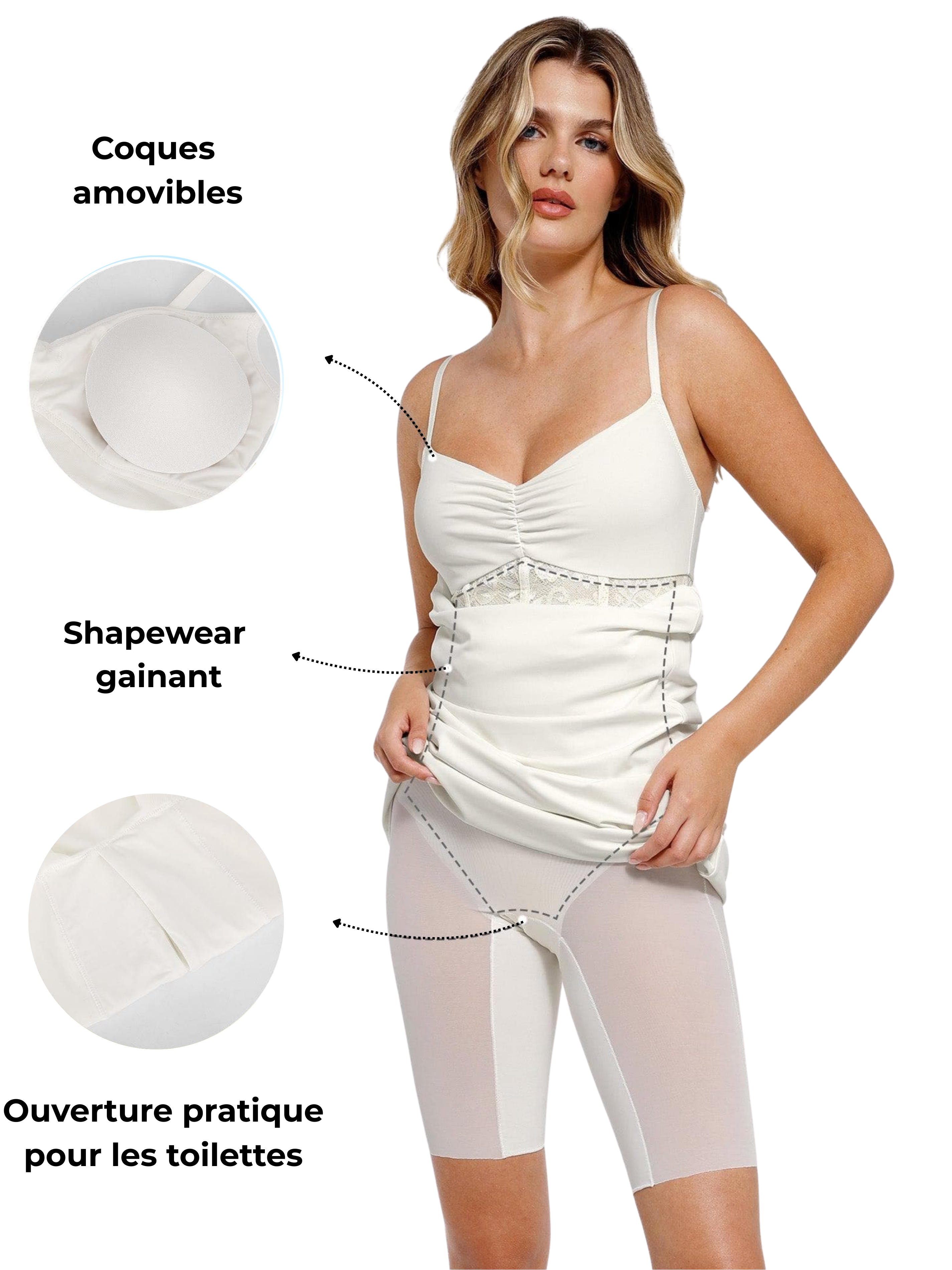 Oui. Le shapewear intégré lisse le ventre, sculpte les hanches et offre un maintien naturel de la poitrine — sans étouffer.
