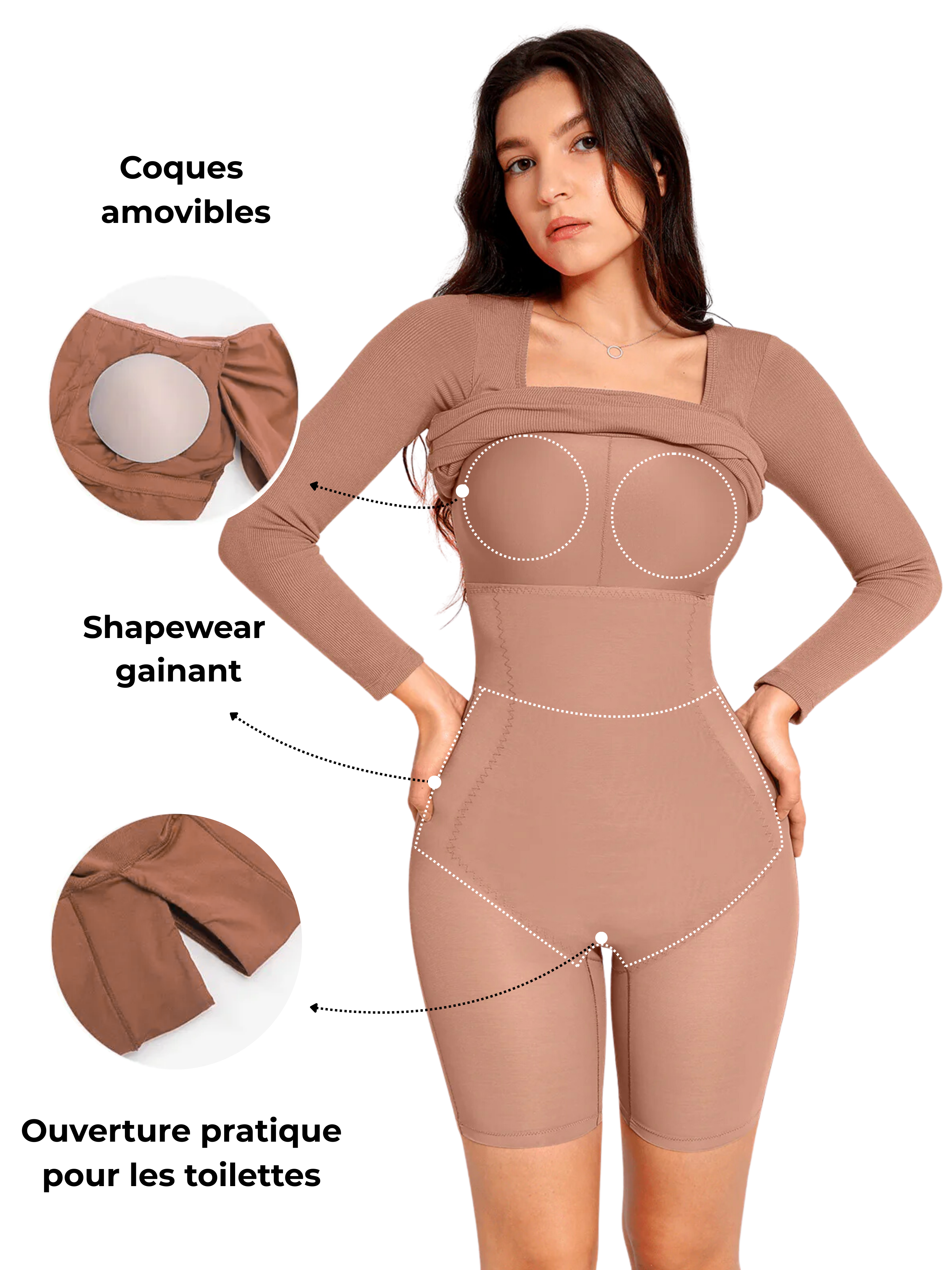 Oui. Le shapewear intégré lisse le ventre, sculpte les hanches et offre un maintien naturel de la poitrine — sans étouffer.