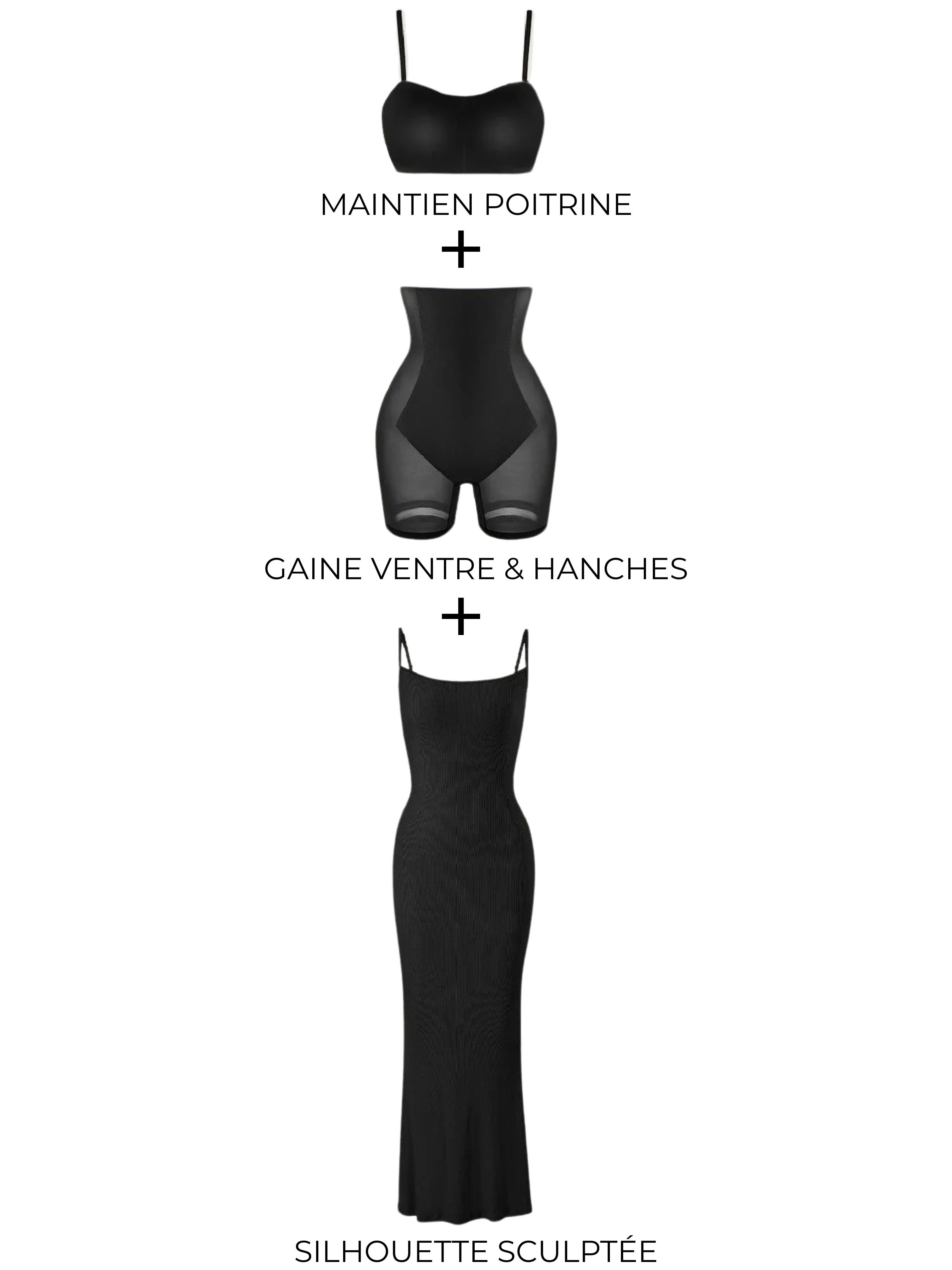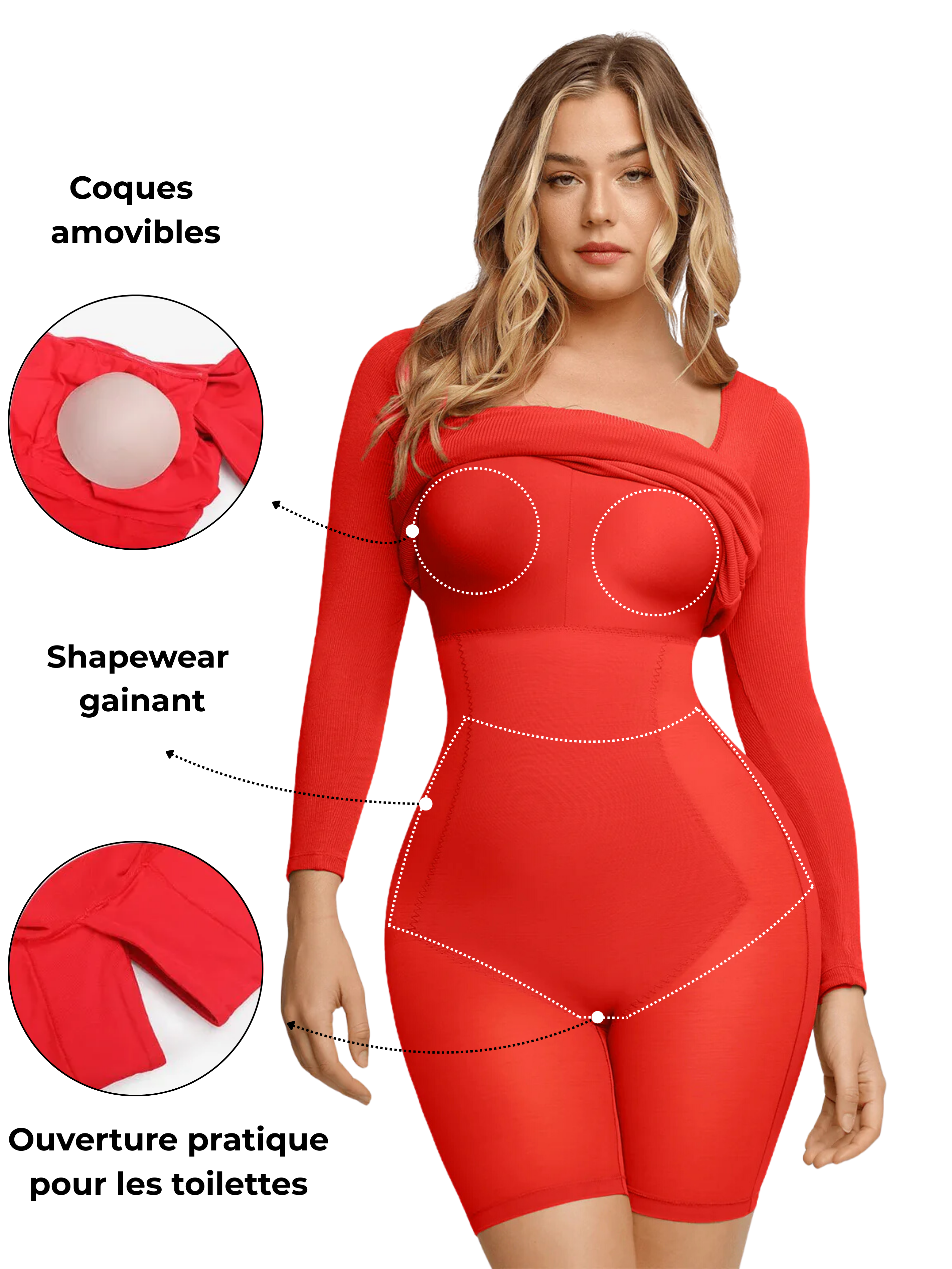 Oui. Le shapewear intégré lisse le ventre, sculpte les hanches et offre un maintien naturel de la poitrine — sans étouffer.